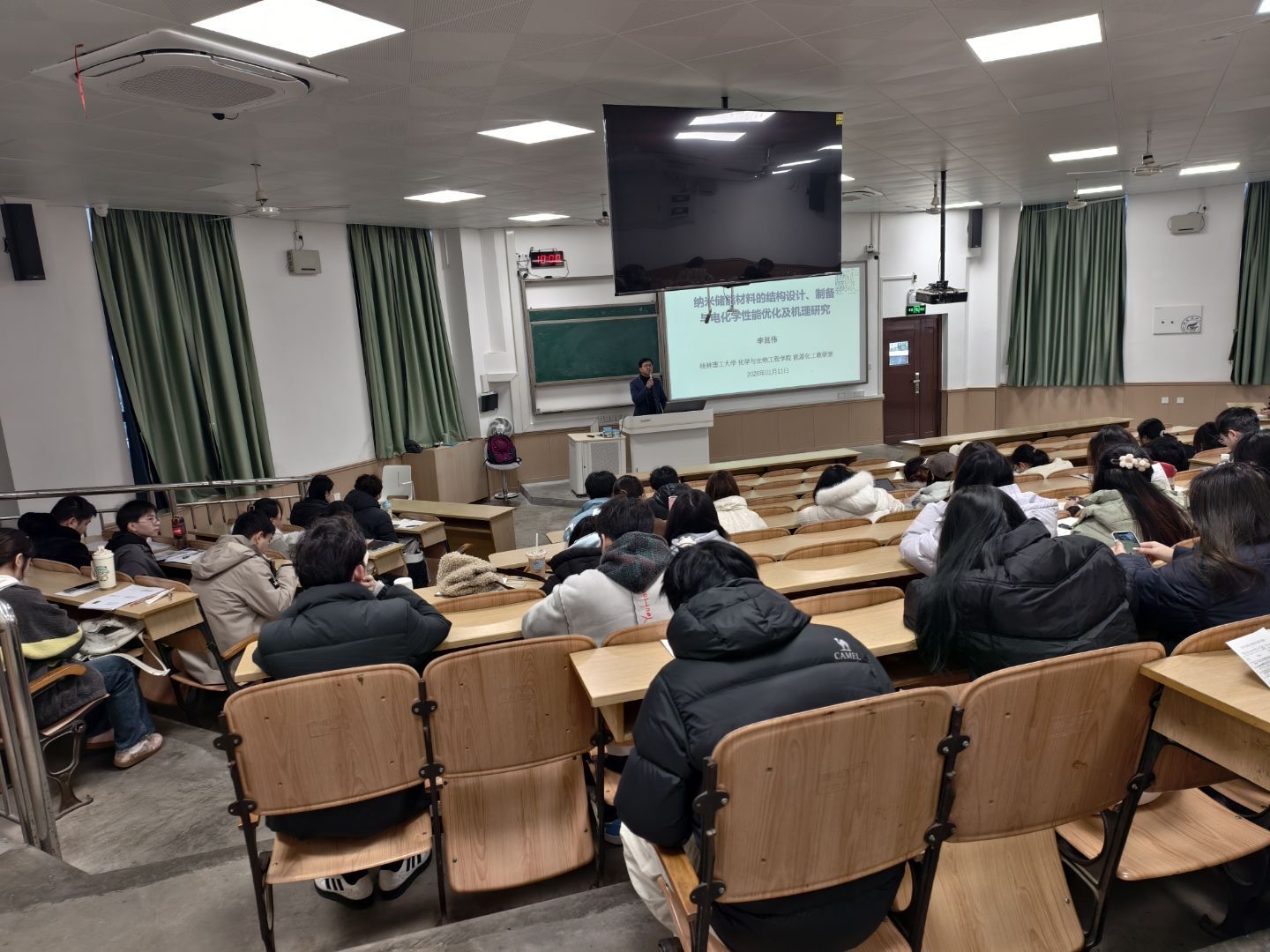 邀请,在我校雁山校区教4栋04110教室作题为《功能导向的配合物材料设计合成与性能研究》的学术报告。报告会由研究生辅导员马亚博老师主持,150余名师生参加。