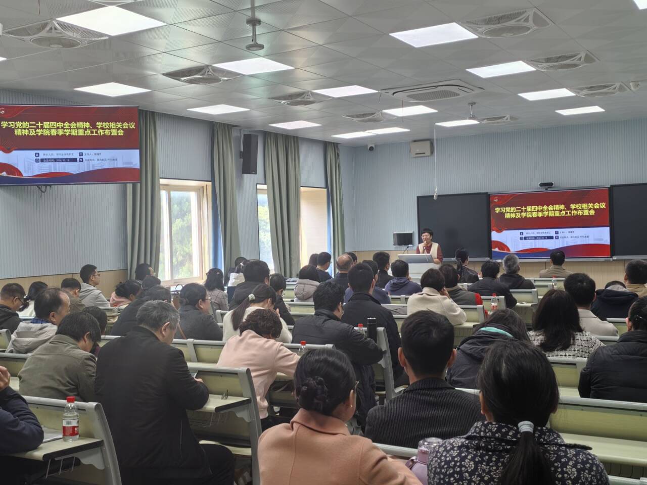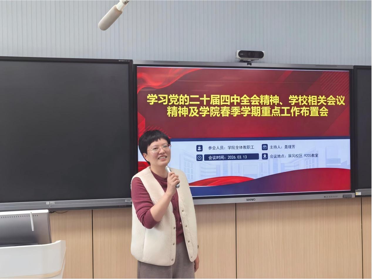 院长聂瑾芳组织学习了党的二十届四中全会精神。她指出,全院上下要将学习贯彻全会精神同落实学校第四次党代会精神紧密结合起来,同学校“十五五”发展的谋篇布局深度衔接,同新学期各项工作的开篇起步一体推进,切实把学习成效转化为强党性、铸忠诚、抓落实、促发展的具体实践。随后,她传达了学校近期召开的春季学期工作会议及相关专题会议精神,强调要紧紧围绕学校确定的年度目标任务,主动担当,积极作为。在部署天天影视
